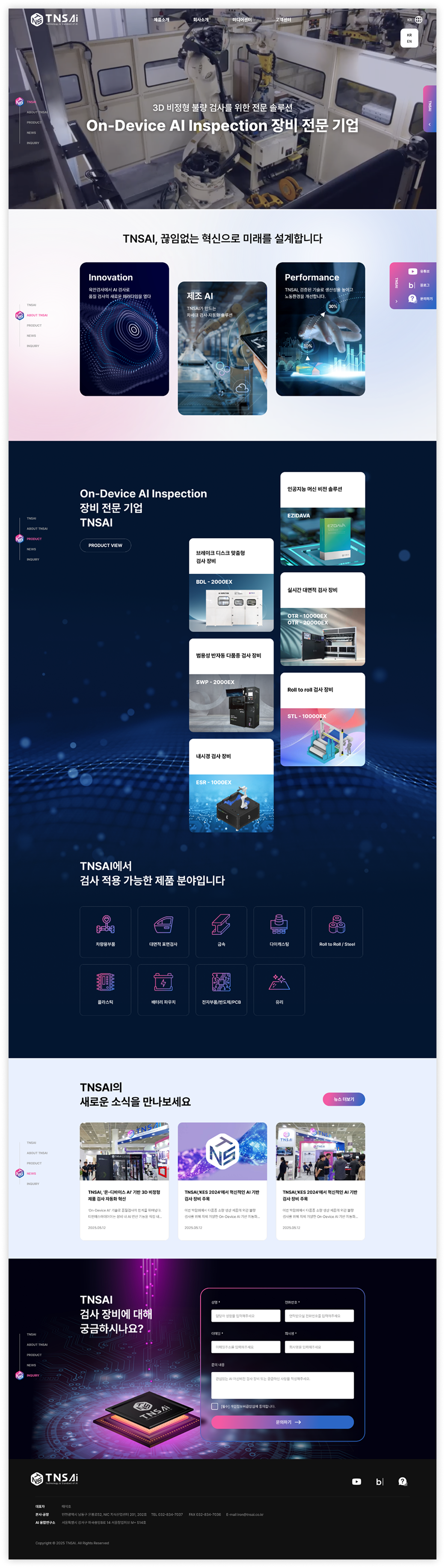 TNS AI가 보유한 첨단 검사 기술과 자동화 솔루션을 보다 명확하고 전문적으로 전달하기 위해 웹사이트가 전면 리뉴얼되었습니다. 단순한 정보 재배치가 아니라, 기업의 기술적 신뢰성과 브랜드 가치가 웹사이트 전반에서 자연스럽게 드러나도록 콘텐츠 구조와 디자인 방향을 새롭게 정립하는 데 집중했습니다. 이를 통해 복잡한 기술 기반 콘텐츠도 사용자가 쉽게 이해할 수 있도록 개선했으며, TNS AI의 시장 경쟁력과 기술적 우위를 효과적으로 전달하는 웹사이트로 재구성되었습니다.